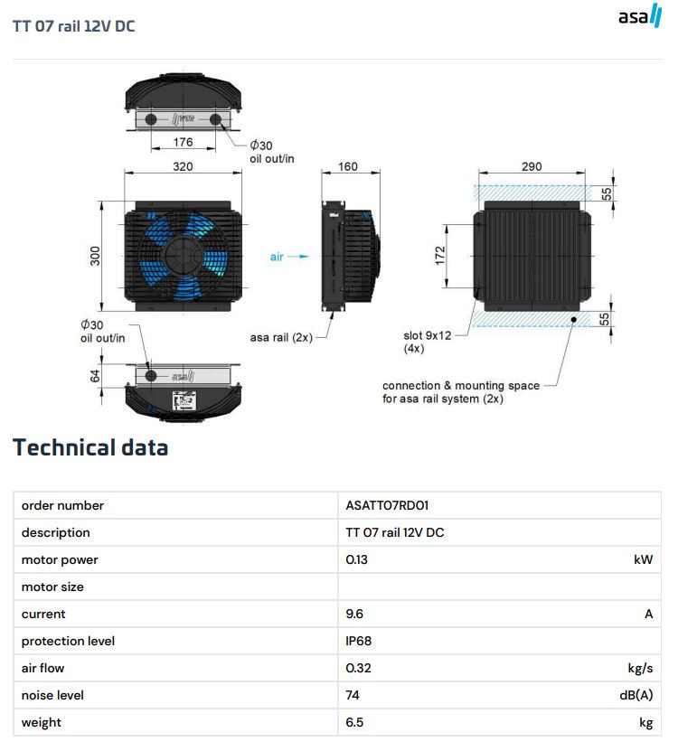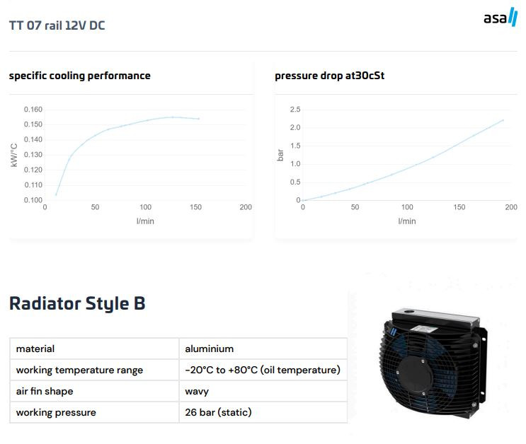 Model ASATT07RD01 je spoľahlivý olejový/vzduchový chladič zo série TT od ASA Hydraulik, poháňaný napätím 12V DC. Bol vyvinutý špeciálne pre mobilné hydraulické systémy – pracovné stroje, úžitkové vozidlá a iné mobilné aplikácie. Kompaktné rozmery a patentovaný systém asa rail umožňujú flexibilnú montáž a rýchle, bezpečné zapojenie takmer v akejkoľvek konfigurácii stroja. Hliníkový radiátor s vlnovými lamelami efektívne odvádza teplo pri nízkej tlakovej strate, zatiaľ čo ventilátor s ochranou IP 68 zaručuje dlhú životnosť aj v prašnom alebo vlhkom prostredí. Maximálny prevádzkový tlak chladiča je 26 bar (statický) a spoľahlivo pracuje pri teplotách oleja od -20°C do +80°C.