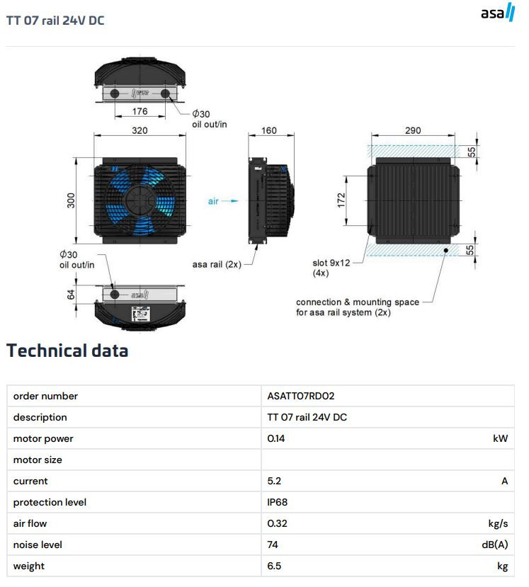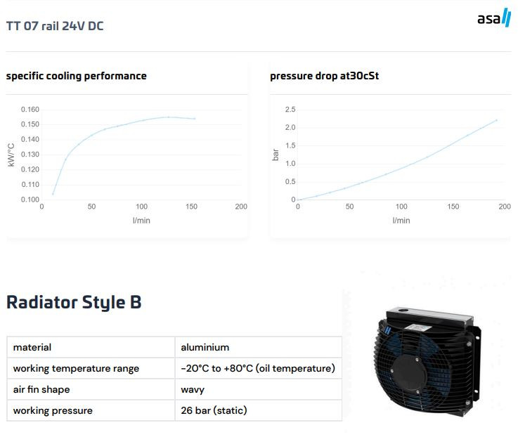 Model ASATT07RD02 je olejový/vzduchový chladič zo série TT od ASA Hydraulik s napájaním 24V DC. Fyzicky totožný s 12V verziou, no ideálny pre vozidlá a stroje s vyšším palubným napätím. Kompaktná konštrukcia, patentovaný systém asa rail a nízka spotreba prúdu (len 5,2 A) robia tento model zvlášť atraktívnym pri požiadavke minimalizácie strát v kabeláži alebo pripojenia na existujúcu 24V elektrickú sieť. Hliníkový radiátor s vlnovými lamelami a ventilátor s ochranou IP 68 spolu zabezpečujú trvalé a spoľahlivé odvádza tepla aj v prašnom či vlhkom prostredí.