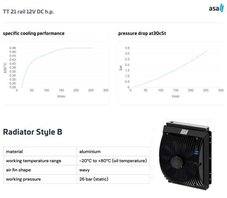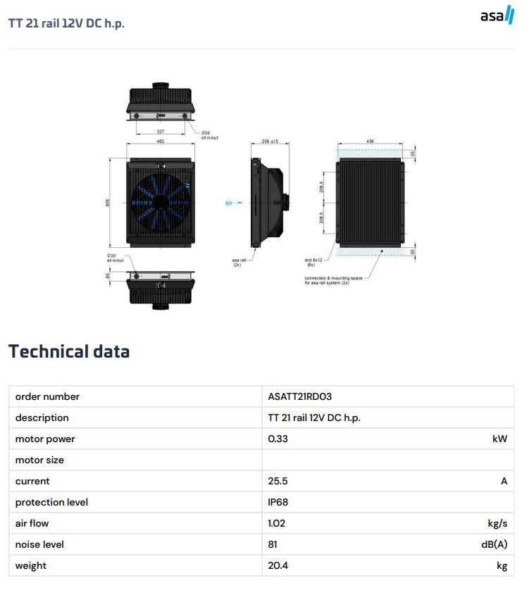 Model ASATT21RD03 je veľkorozmerný olejový/vzduchový chladič zo série TT od ASA Hydraulik v prevedení 12V DC high power, ktorý patrí medzi najvýkonnejšie jednosmerné modely série. Bol vyvinutý pre vysokovýkonné mobilné hydraulické systémy, kde chladiaci výkon štandardných DC modelov nestačí – napríklad na ťažkých strojoch, lesníckych a banských vozidlách či vysokovýkonných mobilných priemyselných zariadeniach. Prietok vzduchu 1,02 kg/s dosiahnutý ventilátorom high power zaručuje výnimočné odvodzovanie tepla, no je potrebné zohľadniť odber prúdu 25,5 A pri návrhu elektrickej sústavy vozidla. Patentovaný systém asa rail, hliníkový radiátor s vlnovými lamelami a motor s ochranou IP 68 spoločne zaručujú spoľahlivú a dlhodobú prevádzku aj za najnáročnejších podmienok.