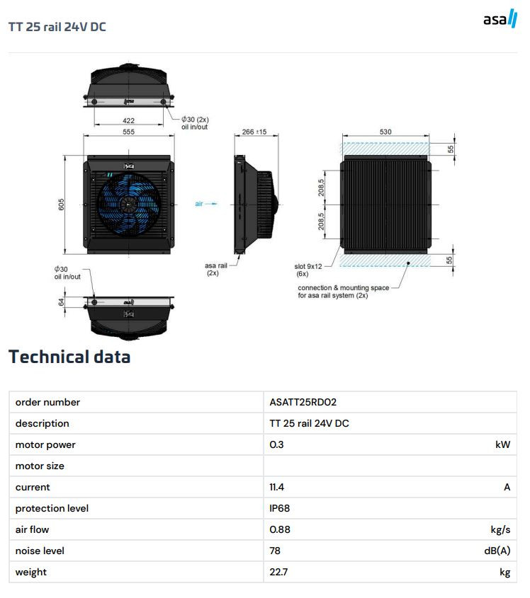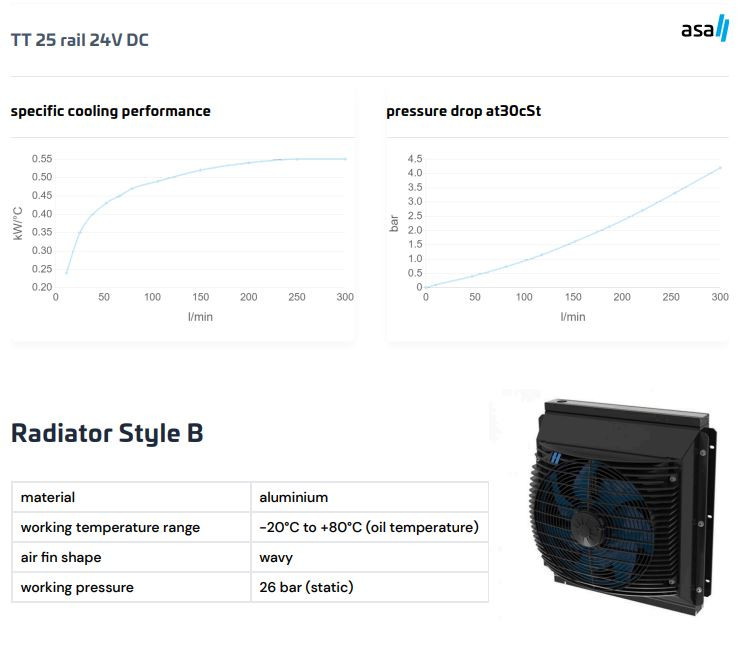 Model ASATT25RD02 je najväčší štandardný olejový/vzduchový chladič zo série TT od ASA Hydraulik s napájaním 24V DC, ktorý predstavuje vrchol jednosmerných prevedení v sérii. Je ideálny pre vysokovýkonné mobilné hydraulické systémy s maximálnymi požiadavkami na chladiaci výkon – napríklad ťažké stroje, priemyselné pojazdy, lesníckú a stavebnú techniku. Mimoriadne priaznivý pomer výkon/príkon: prietok vzduchu 0,88 kg/s dosahuje s motorom len 0,30 kW a prúdovým odberom 11,4 A, čo je šetrné k 24V palubnej sieti. Veľká plocha radiátora, patentovaný systém asa rail, hliníkový radiátor s vlnovými lamelami a ventilátor s ochranou IP 68 robia z tohto modelu najuniverzálnejšiu vysokovýkonnú voľbu v sérii TT.