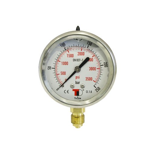 Glycerínový manometer s priemerom DN 63 a spodným (vertikálnym) pripojením, závit 1/4" BSP. Glycerínová náplň tlmí vibrácie a tlakové rázy, čím zaručuje stabilnejší a presnejší odčítaný údaj v hydraulických systémoch a priemyselných aplikáciách. Prístroj disponuje dvojitou stupnicou bar/psi a krytím IP65, čo zaručuje spoľahlivú prevádzku aj v prašnom alebo vlhkom prostredí.