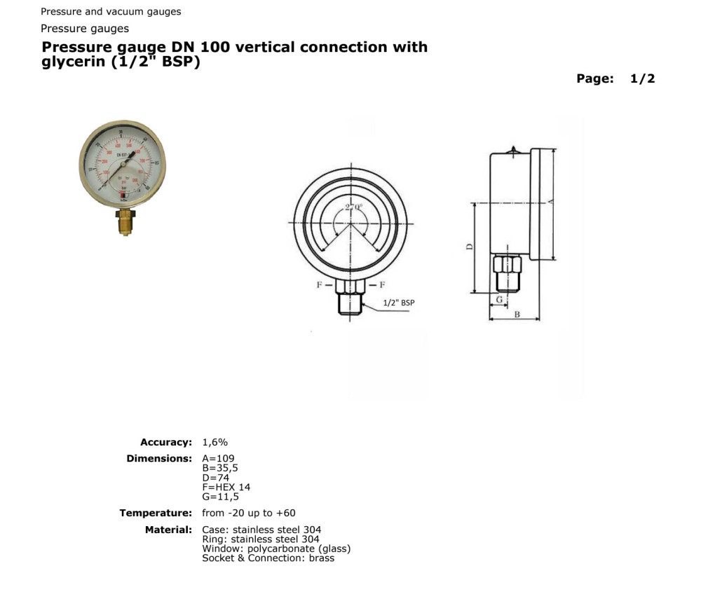 Glycerínový manometer s priemerom DN 100 a spodným (vertikálnym) pripojením, závit 1/2" BSP. Glycerínová náplň tlmí vibrácie a tlakové rázy, čím zaručuje stabilnejší a presnejší odčítaný údaj v hydraulických systémoch a priemyselných aplikáciách. Prístroj disponuje dvojitou stupnicou bar/psi a krytím IP65, čo zaručuje spoľahlivú prevádzku aj v prašnom alebo vlhkom prostredí.