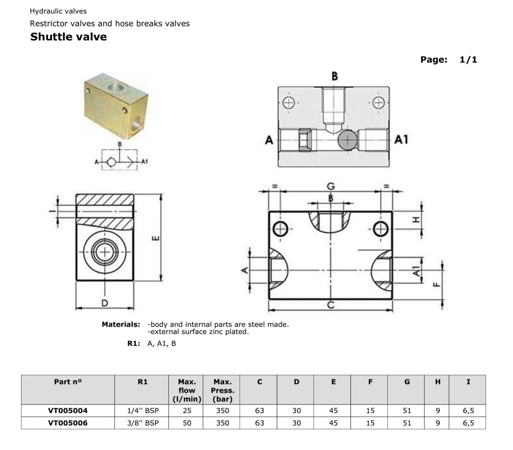 VT005006 je striedavý ventil (shuttle valve), ktorý v hydraulických systémoch automaticky prepúšťa na výstup tú z dvoch vetví, ktorá má vyšší tlak. Je použiteľný v tlakových riadiacich a pilotných okruhoch, kde je potrebný spoľahlivý výber tlaku. Vyrobený z ocele s pozinkovaným vonkajším povrchom.