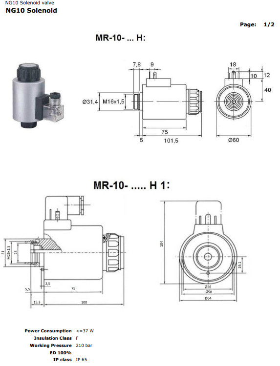 MR-10-12CC H je náhradná solenoidová cievka veľkosti NG10, navrhnutá pre napätie 12V DC, kompatibilná s hydraulickými smerovými ventilmi štandardu NG10. Zaťažovateľ 100% (ED 100%) umožňuje nepretržitú prevádzku bez rizika prehriatia cievky – čo je v priemyselných aplikáciách obzvlášť dôležité. Príkon nepresahuje 37 W a trieda izolácie F zaručuje dlhú životnosť a odolnosť voči teplu. Stupeň krytia IP65 poskytuje dostatočnú ochranu pred prachom a vodným prúdom. Maximálny prevádzkový tlak je 210 bar.
