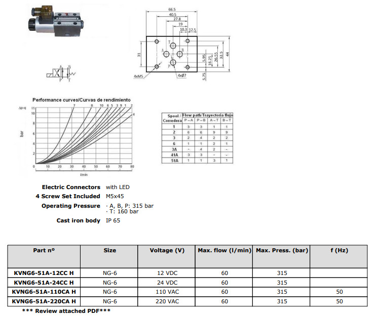 KVNG6-51A-24CC H je hydraulický smerový ventil veľkosti NG6, jednocievkový, s konfiguráciou šúpatka 51A, navrhnutý pre priemyselné a mobilné hydraulické systémy. Solenoid napájaný napätím 24V DC zabezpečuje spoľahlivé spínanie a vstavaný LED indikátor na prvý pohľad ukáže, či je ventil v aktívnom stave. Teleso z liatiny ponúka stupeň krytia IP65, takže ventil možno bez problémov používať aj v prašnom alebo vlhkom priemyselnom prostredí. Na portoch A, B a P zvládne maximálny prevádzkový tlak 315 bar, na porte T je hodnota 160 bar – tento rozsah parametrov je viac než dostatočný pre väčšinu ťažkých strojov a priemyselných aplikácií. Ventil zvláda maximálny prietok 60 l/min a v balení sú priložené skrutky M5×45 potrebné na montáž.