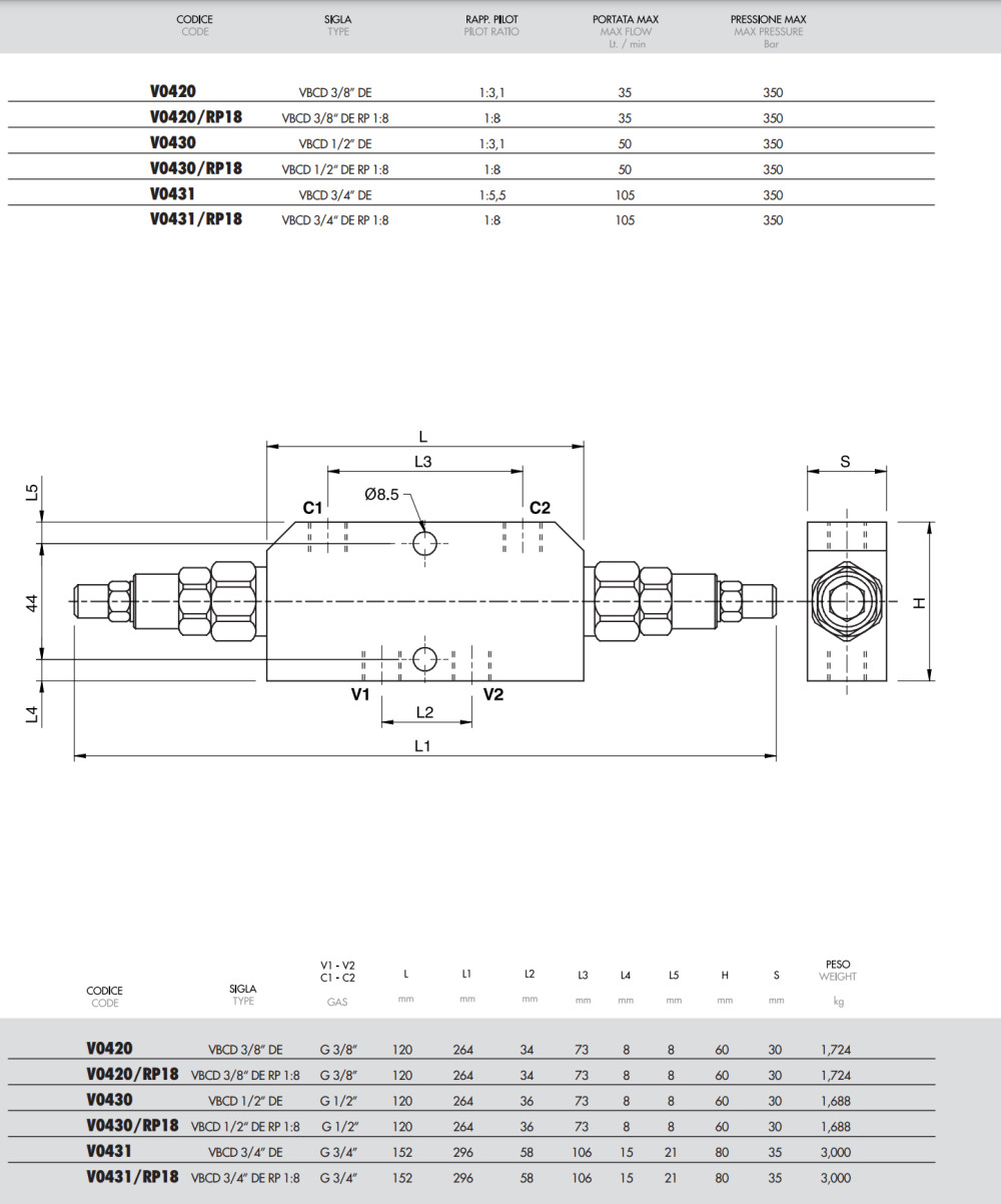 Typ V0431 VBCD 3/4" DE dvojitý brzdiaci ventil overcenter s držaním záťaže slúži na reguláciu pohybu hydraulických aktuátorov v oboch smeroch a ich spoľahlivé zablokovanie. Ventil zabezpečuje kontrolované spúšťanie a zdvíhanie záťaže, zabraňuje nekontrolovanému pohybu vplyvom vlastnej hmotnosti záťaže a kavitácii aktuátora. In-line vyhotovenie umožňuje univerzálnu montáž aj vo vysoko zaťažených systémoch.