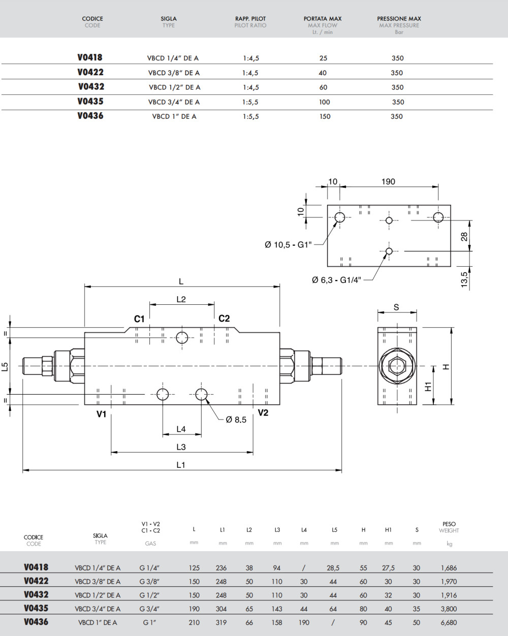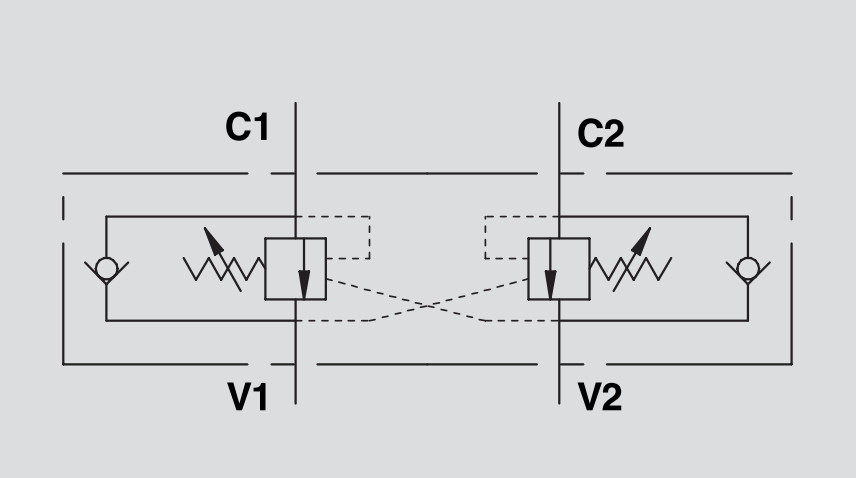 Typ V0422 VBCD 3/8" DE A dvojitý brzdiaci ventil overcenter s držaním záťaže slúži na riadenie pohybu hydraulických aktuátorov v oboch smeroch a ich spoľahlivé zablokovanie. Ventil zabezpečuje kontrolované spúšťanie záťaže a zabraňuje nekontrolovanému pohybu vplyvom vlastnej hmotnosti záťaže a kavitácii aktuátora. Vyhotovenie typu „A" sa prispôsobuje špeciálnym požiadavkám na montáž vďaka odlišnému rozloženiu prípojok a pilotného pomeru.