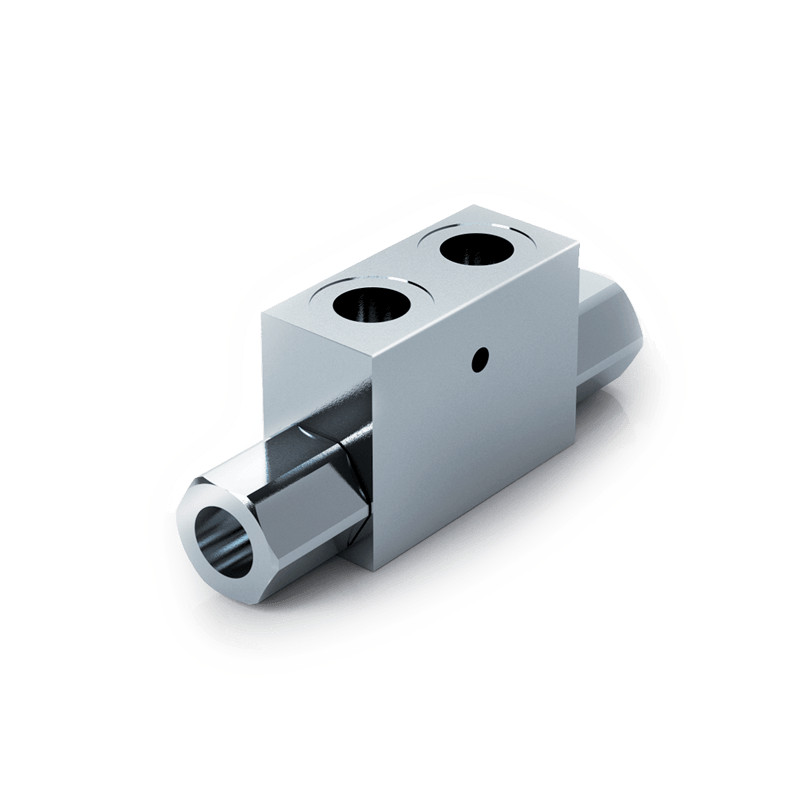 Typ V0010 VBPDE 1/4" dvojitý pilotne ovládaný spätný ventil slúži na spoľahlivé zablokovanie hydraulických valcov v oboch smeroch pohybu. Ventil umožňuje voľný prietok v jednom smere, pričom opačný smer blokuje dovtedy, kým nie je privedený dostatočný pilotný tlak, čím zabezpečuje spoľahlivé držanie polohy.