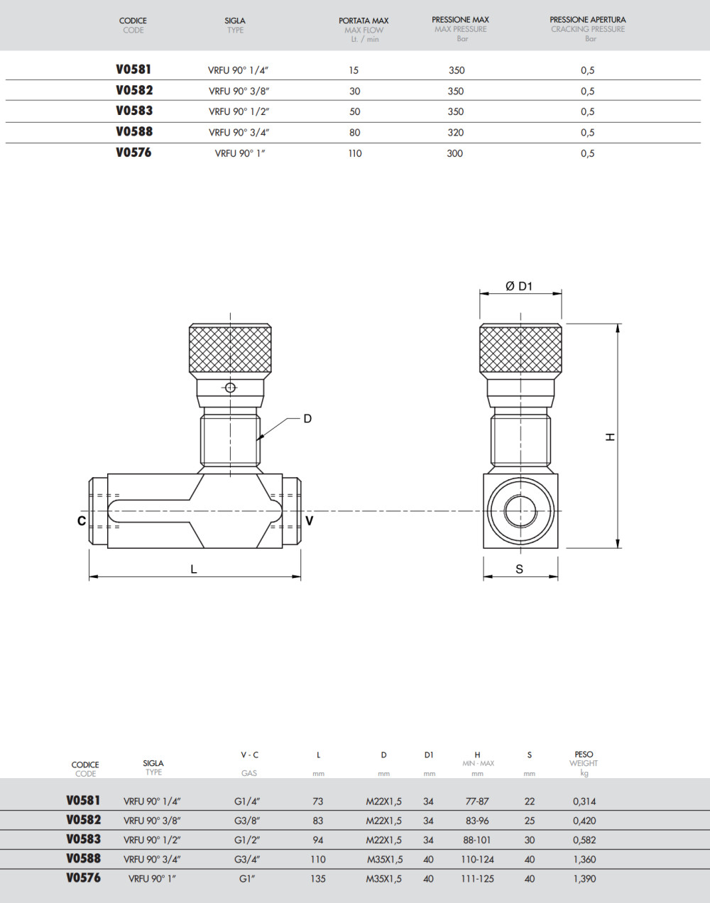 V0581 typ VRFU 90° jednosmerný regulačný ventil prietoku slúži v hydraulických systémoch na reguláciu rýchlosti aktuátora v jednom smere, pričom v opačnom smere zabezpečuje voľný prietok. Vyhotovenie 90° umožňuje kompaktnú montáž aj v stiesnených priestoroch. Ventil nie je tlakovo kompenzovaný, preto prietok závisí od tlaku systému a viskozity oleja, napriek tomu poskytuje presné a citlivé nastavenie.