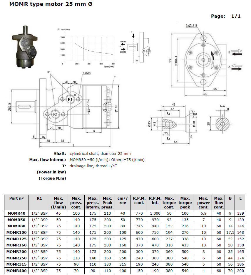 A MOMR125 hydromotor kompaktnej konštrukcie s vysokým krútiacim momentom, vynikajúco využiteľný v pracovných strojoch, mobilných hydraulických systémoch a priemyselných pohonoch. A 25 mm átmérőjű hriadeľ, masívne uloženie ložísk a špičkový tlak 200 bar zabezpečujú spoľahlivú a dlhodobú prevádzku. Motor je vybavený 1/2" BSP pripojeniami a 1/4” odvodným pripojením pre drenážny olej (T). A gyártói adatok alapján a 125 cm³/ot geometrického objemu je ideálna voľba pre hydraulické aplikácie s nižšími otáčkami, ale vysokými požiadavkami na krútiaci moment.