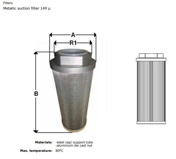 Ide o hydraulický sací filter s kovovou konštrukciou a jemnosťou filtrácie 149 µm, 1 1/2" BSP csatlakozással. A szűrő maximális térfogatárama 80 l/min, legnagyobb megengedett üzemi hőmérséklete 80 °C. Konštrukcia je vyhotovená s oceľovým vekom a opórnou trubkou a hliníkovou odlievanou maticou.